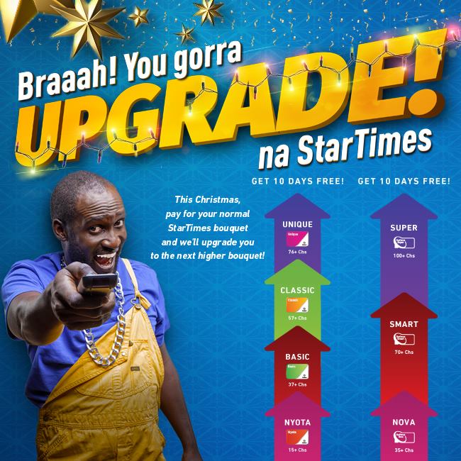Starting TODAY,all through to 31st January, we will be upgrading you to the next HIGHER BOUQUET when you top up A FULL MONTH subscription on your current bouquet i.e. For aerial decoder customers, (for every monthly subscription made on the Nyota bouquet, subscribers will access Basic bouquet, customers enrolling to Basic will automatically be upgraded to Classic, subscribers enrolling to the Classic bouquet, will access Unique bouquet while those enrolling to Unique will have access to ten extra days at no extra cost. For Satellite customers; Top up 1 Month Nova, get 1 Month Smart Bouquet, Top up 1 Month Smart, get 1 Month Super Bouquet ,Top up 1 Month Super, get 10 Days extra).